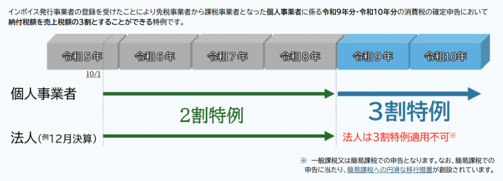 - 法人は対象外です。「3割特例」は個人事業者(フリーランス・個人事業主)に限定された措置です。法人成りをしたマイクロ法人などで現在2割特例を利用している場合でも、2027年以降は本則課税または簡易課税へ移行するため、早急な資金繰りの見直しが不可欠です。
