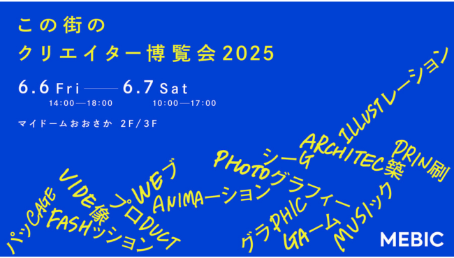 公益財団法人大阪産業局が運営するクリエイティブ産業振興施設「クリエイティブネットワークセンター大阪 メビック」は、大阪・関西万博の開催期間中である2025年6月6日(金)~7日(土)の2日間にわたり、展示イベント〈この街のクリエイター博覧会2025〉をマイドームおおさかで開催。デザイン、Web、映像、ゲーム、建築など多彩なジャンルのクリエイターが集結し、国内外から182組が出展する。