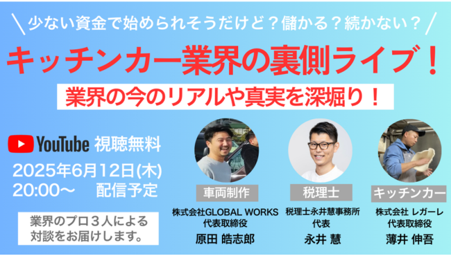 “本格石窯ピザ”のキッチンカー営業を行いながら、開業支援を展開している株式会社レガーレは、ライブトーク〈キッチンカー業界の裏側ライブ!業界の今やリアルや真実を深堀り!〉を2025年6月12日(木)20:00からYouTubeで配信。車両制作、税理士、キッチンカーオーナーの3者が、業界の噂や真実を深掘りする対談形式にて実施予定。