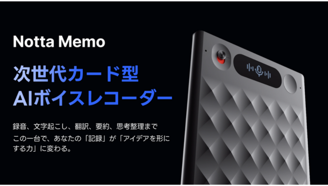 Notta株式会社は、AI議事録サービス「Notta」と連携するAIボイスレコーダー「Notta Memo」を2025年6月16日(月)より一般発売。本製品は、ビジネスシーンにおけるAIを活用した議事録作成ツールの需要に応えるために開発されたもの。4つのMEMSマイクと骨伝導マイクを搭載し、Wi-FiやBluetooth経由で録音データをNottaアプリに自動転送する機能を備える。価格は23,500円(税込)。