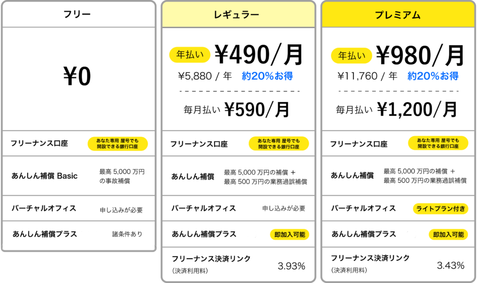 これらの保険は、副業・パラレルワーカーの方にも、専業フリーランスの方と同様に付帯します。より補償が充実するレギュラー/プレミアム会員でも会費はリーズナブルですので、副業の方も検討しやすいのではないでしょうか。